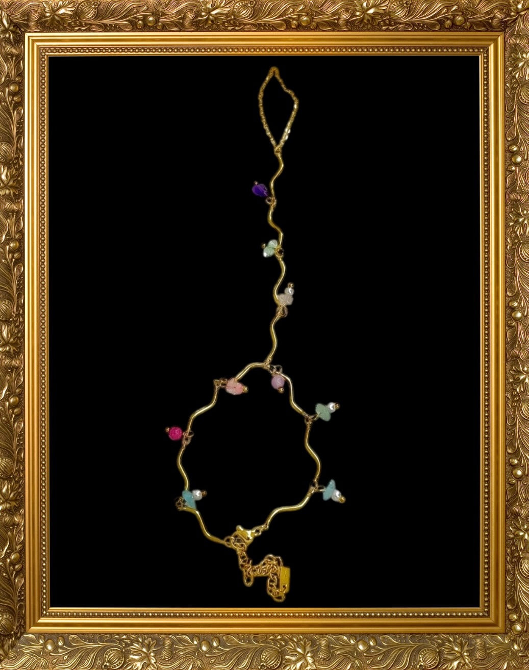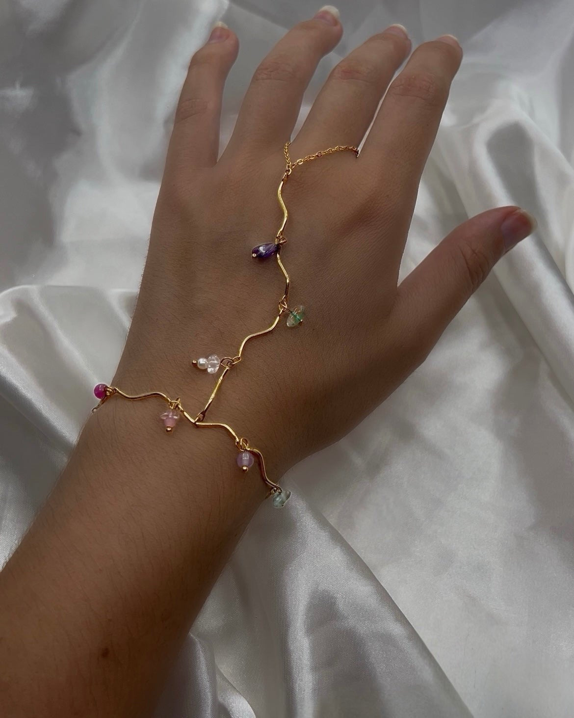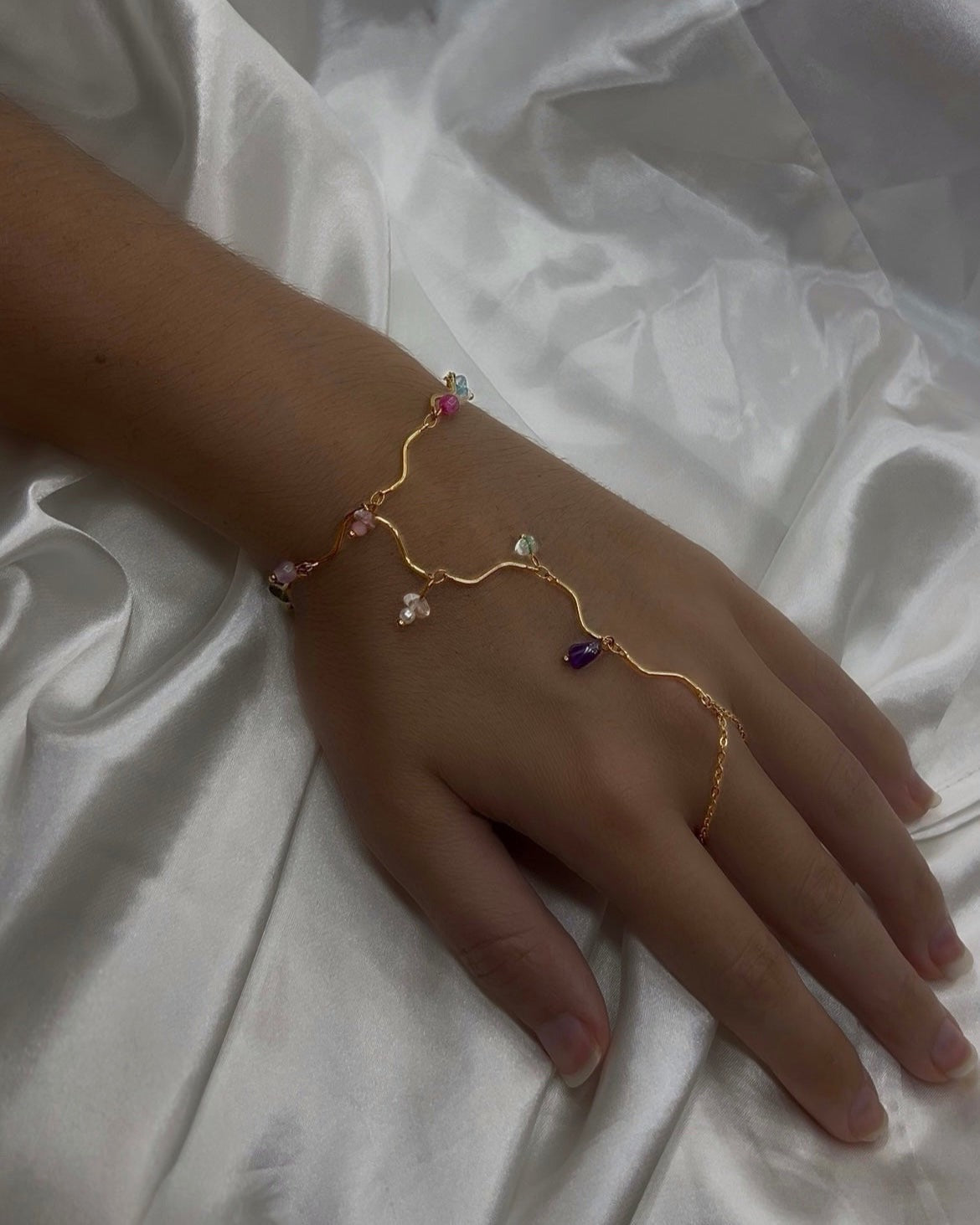 Son fil doré ondule avec le geste, reliant le poignet à l’anneau dans un mouvement doux, presque liquide. De fines pierres multicolores s’y suspendent, comme des gouttes de lumière au creux du soir. Un bijou fluide, solaire, qui capte chaque reflet sans jamais s’imposer.